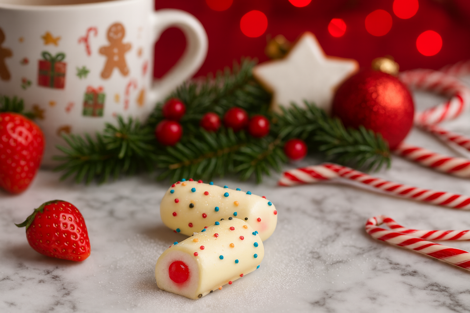 Guimauve fourrée à la fraise enrobé de chocolat blanc