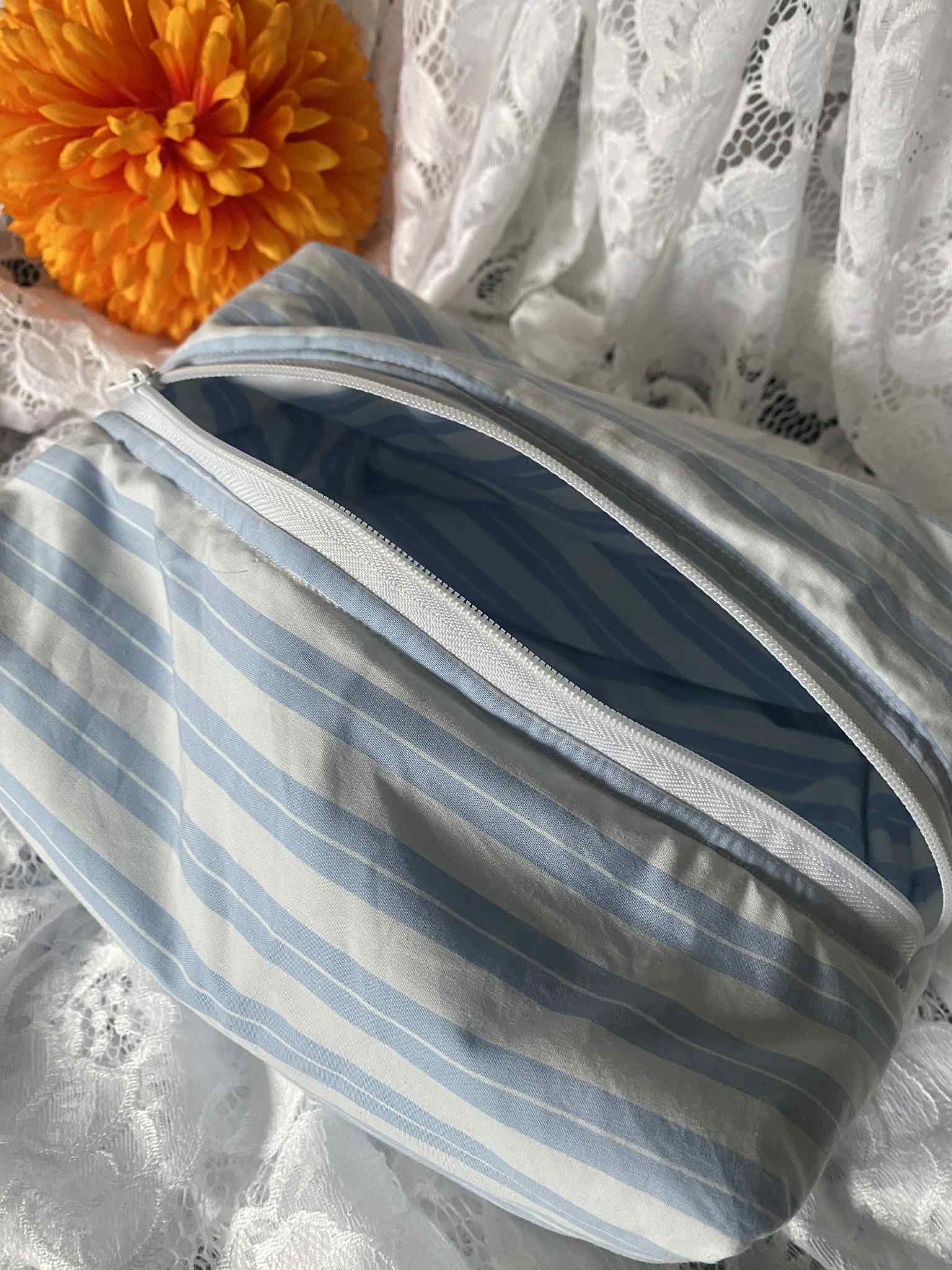 Alliez élégance et praticité avec cette grande trousse de toilette faite main. Son format XL permet d’y glisser facilement tous vos essentiels : soins, maquillage, brosse à cheveux ou accessoires de voyage. Son tissu à rayures bleu et blanc lui apporte un style frais et intemporel, parfait aussi bien pour le quotidien que pour partir en week-end.